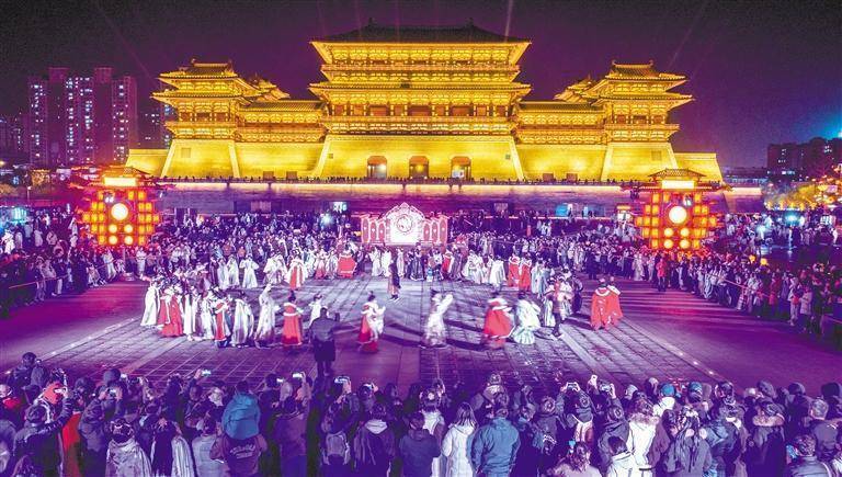12月13日,河南省洛阳市隋唐洛阳城景区应天门北广场,游客在观看《神都狂欢》演出。景区通过增加演出场次、优化灯光效果等措施,为游客营造有感染力的沉浸式体验,激发冬日“夜经济”活力。张怡熙摄(中经视觉)